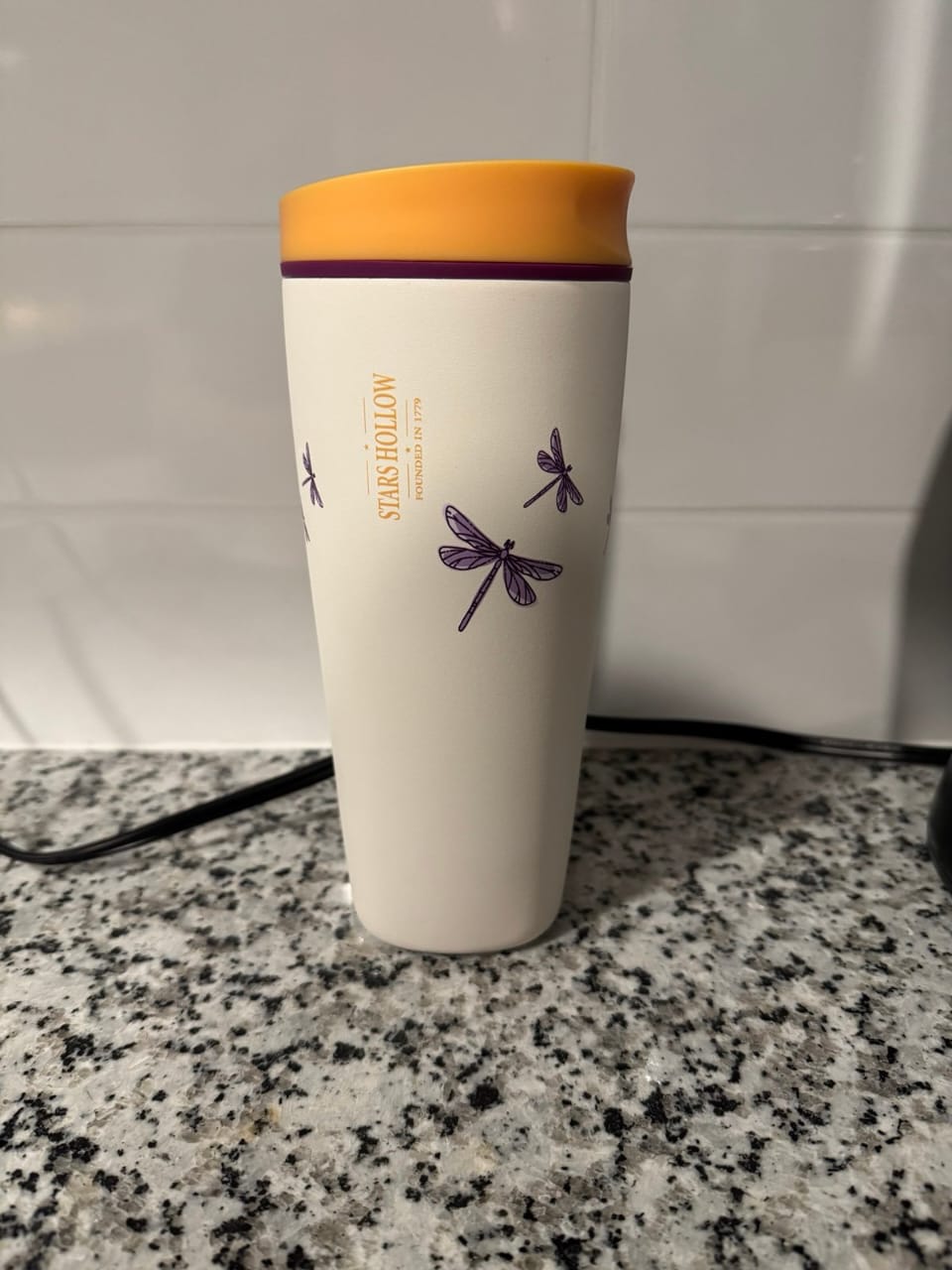 "This cup is literally art! 🦋 The dragonfly pattern is so delicate and dreamy, plus it actually keeps my coffee hot for hours. Already thinking about getting the Luke's one to match!"